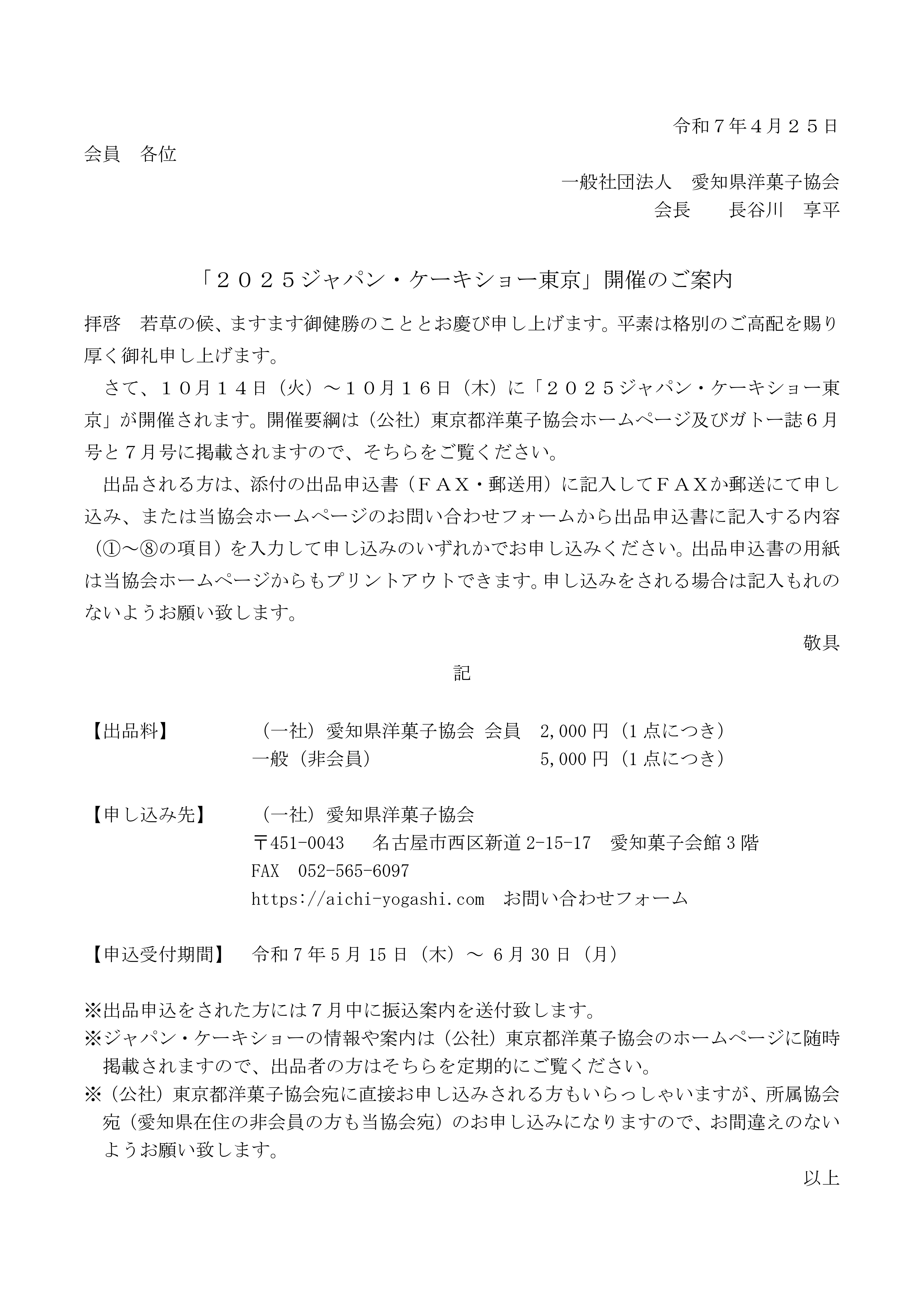 ※ジャパン・ケーキショーの情報や案内は(公社)東京都洋菓子協会のホームページに随時掲載されますので、出品者の方はそちらを定期的にご覧ください。