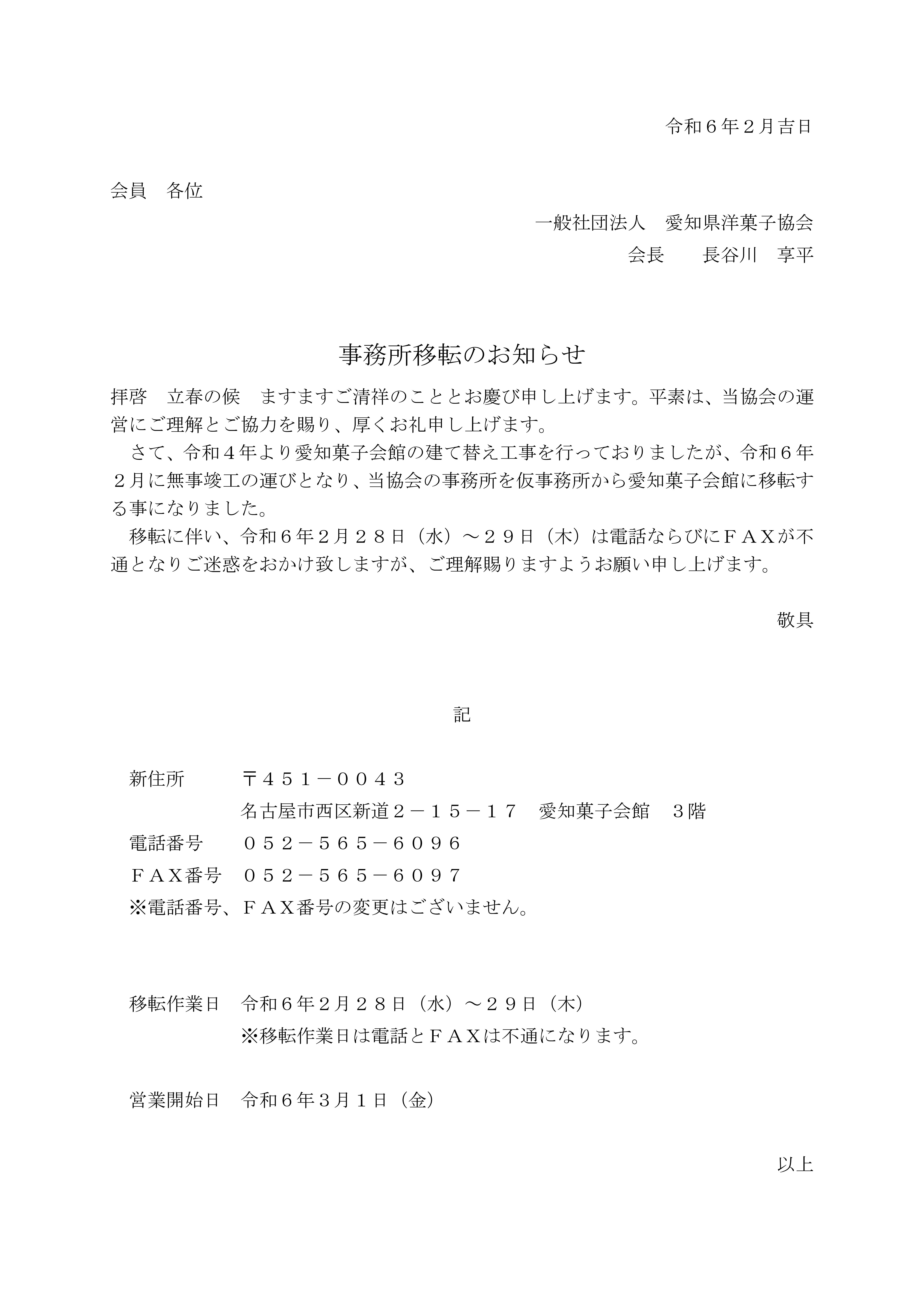 令和4年より愛知菓子会館の建て替え工事を行っておりましたが、 令和6年2月に無事竣工の運びとなり、 当協会の事務所を仮事務所から 愛知菓子会館に移転する事になりました。 移転に伴い、 令和6年2月28日(水)~29日(木)は 電話ならびにFAXが不通となりご迷惑をおかけ致しますが、 ご理解賜りますようお願い申し上げます。
