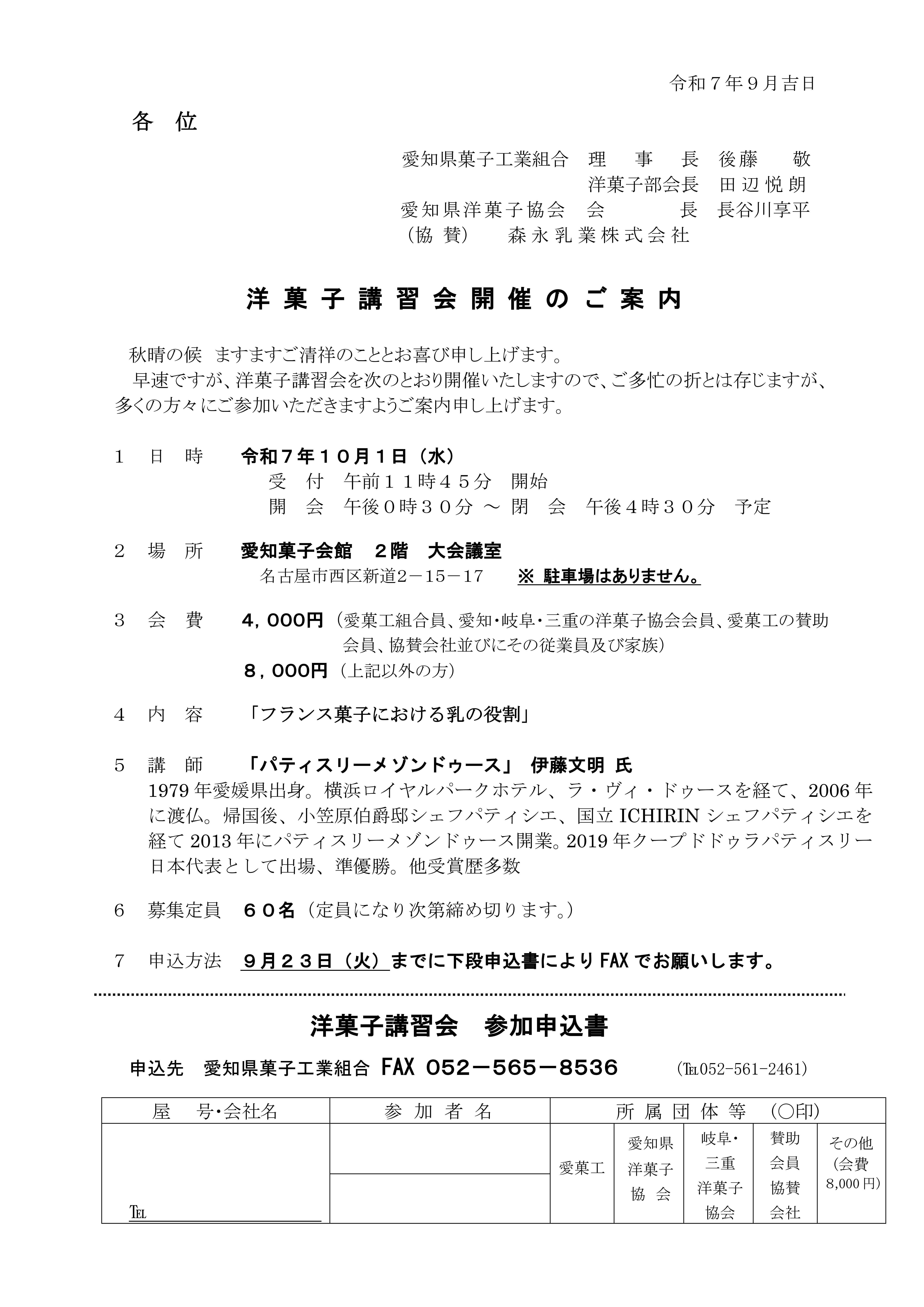 ご希望の方は、下記にある申込書に必要事項をご記入の上、9月23日(火)までにFAXにてお申し込みください。 愛知県菓子工業組合 FAX:052-565-8536 TEL:052-561-2461 |